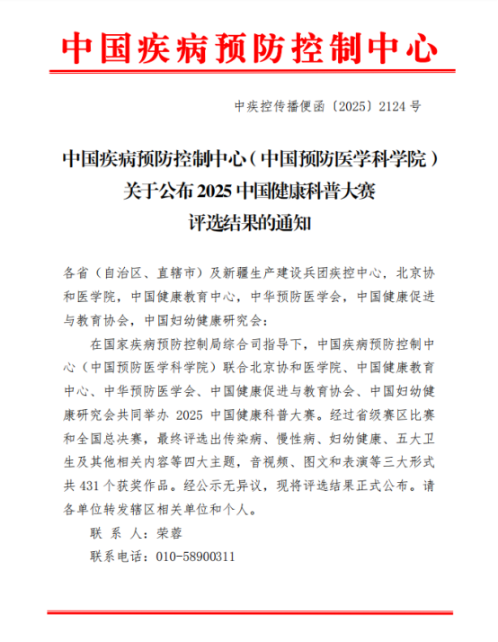 近日,在国家疾病预防控制局综合司指导下,中国疾病预防控制中心(中国预防医学科学院)联合多家权威机构共同主办的“2025中国健康科普大赛”顺利落下帷幕。经过省级赛区选拔与全国总决赛的激烈角逐,我院精心创作报送的科普作品《热情的陷阱》凭借其过硬的质量脱颖而出,斩获全国二等奖。这份荣誉不仅体现了国家级平台对我院科普创作能力的高度认可,更标志着我院健康科普工作迈上了新的台阶。